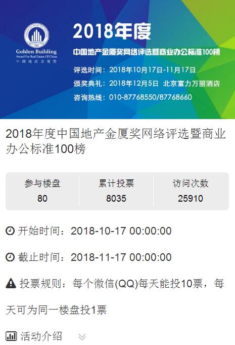 房訊網(wǎng)訊 2018年10月17日,2018年度中國地產(chǎn)金廈獎評選暨商業(yè)地產(chǎn)標準100榜正式啟動,同時宣布"微信投票系統(tǒng)"上線。