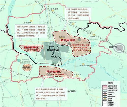 根據(jù)國(guó)家發(fā)展和改革委員會(huì)印發(fā)的《北京新機(jī)場(chǎng)臨空經(jīng)濟(jì)區(qū)規(guī)劃(2016-2020年)》初步規(guī)劃,臨空經(jīng)濟(jì)區(qū)總面積約150平方公里,其中河北部分約100平方公里,北京部分約50平方公里。