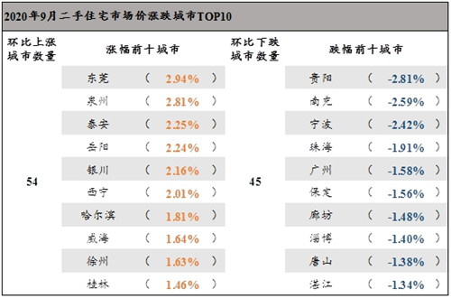 從環(huán)比漲幅前十的城市情況來看,漲幅較大的城市以珠三角、環(huán)渤海以及西北的二線和三四線城市為主。其中,珠三角經(jīng)濟(jì)圈的東莞以2.94%的漲幅居首,海峽經(jīng)濟(jì)圈的泉州以2.81%的漲幅位居第二,環(huán)渤海經(jīng)濟(jì)圈的泰安以2.25%的漲幅位居第三。