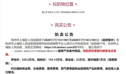 比如,此前,杭州市江干區(qū)丁橋景園南苑成交的一套建筑面積約93平方米的法拍房,獲得5萬人圍觀,最終以總價222萬元成交,這套房子在拍賣公告中就以紅色字體標注房屋內部發(fā)生過命案。