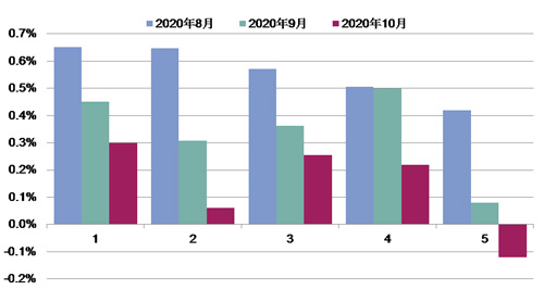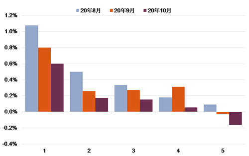 圖4:一、二線城市新建商品住宅銷售價(jià)格指數(shù),2020年10月