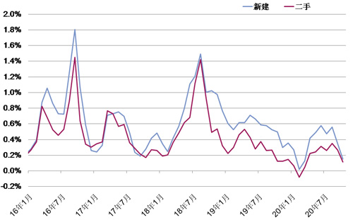 二手住宅價(jià)格繼續(xù)微幅上漲,月度環(huán)比漲幅為0.11%,較9月的0.27%略有放緩。