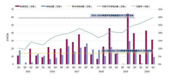 圖1:深圳甲級(jí)寫字樓供應(yīng)、凈吸納量及空置率