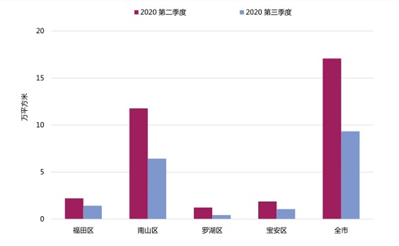 值得注意的是,南山區(qū)內(nèi)TMT行業(yè)集中度高且在疫情期間獲得了新的發(fā)展機(jī)遇,繼續(xù)引領(lǐng)著整體市場(chǎng)。根據(jù)第一太平戴維斯數(shù)據(jù),第三季度,南山區(qū)貢獻(xiàn)了約6.4萬(wàn)平方米,占全市凈吸納量的68.9%。其中,以科技園和前海最為突出,兩片區(qū)受新興產(chǎn)業(yè)青睞,均有超過(guò)2萬(wàn)平方米的凈吸納量。不過(guò),在子市場(chǎng)需求出現(xiàn)了增長(zhǎng)的同時(shí),由于高量供應(yīng)持續(xù)累積,未受疫情影響而顯著放緩,過(guò)量供應(yīng)仍是空置率上升主因。季內(nèi),全市平均空置率環(huán)比上升1.6個(gè)百分點(diǎn),至29.7%。其中,羅湖區(qū)、安區(qū)季內(nèi)無(wú)新增供應(yīng),空置率則環(huán)比回落。