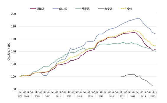 圖3:深圳甲級(jí)寫字樓子市場(chǎng)租金指數(shù)對(duì)比