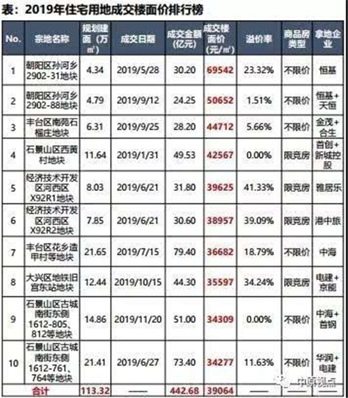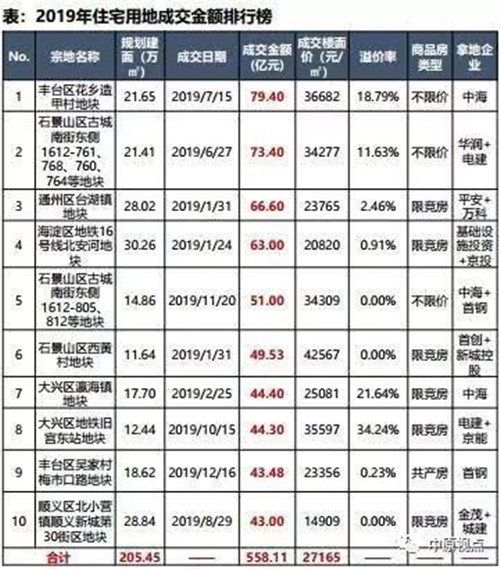 2019年北京土地成交市場中,中海以79.4億元競得豐臺區(qū)花鄉(xiāng)造甲村地塊(不限價), 成交金額最高,恒基孫河地塊成交樓面價最高,該地塊為不限價地塊,成交樓面價69542元/㎡,溢價率23.32%,同時刷新孫河區(qū)成交樓面價記錄。