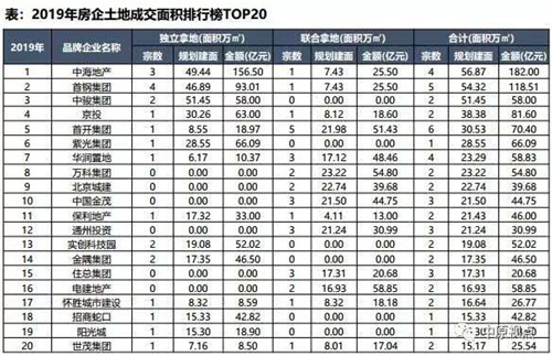 截止2019年年底,中海土地儲備量最大,共成交4宗,成交面積57萬㎡,其中獨立拿地3宗,聯(lián)合拿地1宗;其次是首鋼,拿地5宗。