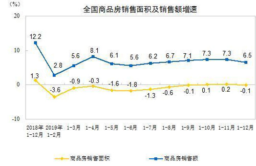 2019年,商品房銷售面積171558萬平方米,比上年下降0.1%,1—11月份為增長0.2%,上年為增長1.3%。其中,住宅銷售面積增長1.5%,辦公樓銷售面積下降14.7%,商業(yè)營業(yè)用房銷售面積下降15.0%。商品房銷售額159725億元,增長6.5%,增速比1—11月份回落0.8個(gè)百分點(diǎn),比上年回落5.7個(gè)百分點(diǎn)。其中,住宅銷售額增長10.3%,辦公樓銷售額下降15.1%,商業(yè)營業(yè)用房銷售額下降16.5%。