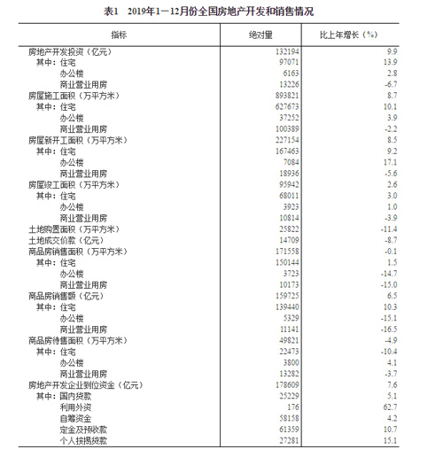 2019年末,商品房待售面積49821萬平方米,比11月末增加600萬平方米,比上年末減少2593萬平方米。其中,住宅待售面積比11月末增加192萬平方米,辦公樓待售面積增加105萬平方米,商業(yè)營業(yè)用房待售面積增加84萬平方米。