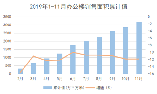 房訊網(wǎng)訊 觀點指數(shù)分析報告指出,2019年以來,寫字樓市場需求呈現(xiàn)出放緩狀態(tài)。從銷售情況來看,2019年1-11月,我國辦公樓的銷售面積呈現(xiàn)逐月上升的穩(wěn)定狀態(tài),但累計增速卻均處于負(fù)增長狀態(tài),基本維持在-10%以下。