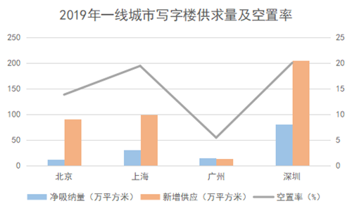 在供求方面,從2019年全年來看,除廣州外,我國一線城市吸納量均小于新增供應(yīng)量,供求關(guān)系的不平衡成為了北上深三地空置率較高的原因之一,直接拉動空置率上升。其中,深圳的凈吸納量和新增供應(yīng)量均位居一線城市之首,達(dá)200萬平方米以上的新增供應(yīng)量給市場去化帶來了不少壓力。