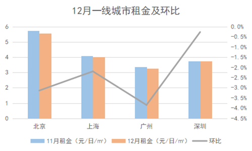 在寫字樓租金方面,12月,我國一二線城市的寫字樓日租金排行依次是北京、上海、深圳、廣州,總體而言維持較為穩(wěn)定的狀態(tài),雖環(huán)比均有輕微下降,但幅度在正常區(qū)間內(nèi),其中深圳的降幅最小,廣州的降幅最大。
