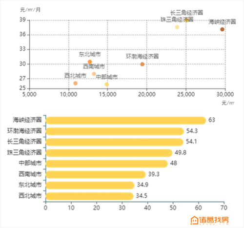 分區(qū)域來看,海峽經(jīng)濟(jì)圈平均售租比為63年,位居首位;其次為環(huán)渤海經(jīng)濟(jì)圈,售租比54.3年,主要是受到青島、石家莊、濟(jì)南、北京等高售租比城市的帶動(dòng);長(zhǎng)三角經(jīng)濟(jì)圈售租比為54.1年,其中蘇州、寧波、常州位居前三,均高于一線城市上海的售租比。