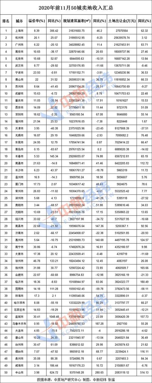 中原地產(chǎn)研究中心統(tǒng)計數(shù)據(jù)顯示,2020年前11月50城賣地收入3.67萬億,同比增20.8%,均刷新歷史紀(jì)錄。