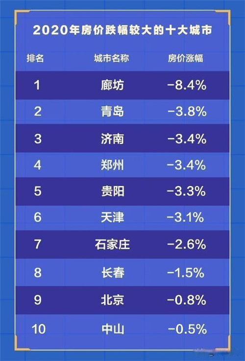 房價跌幅榜單中,廊坊以8.4%的跌幅居于榜首,廊坊房價仍未走出2017年以來的下跌通道,今年疫情之下,房價跌幅同比擴大。山東省頭部城市青島、濟南房價跌幅分列榜單第二、第三位。房價下跌的以北方城市為主,TOP10中占據(jù)8席。貝殼研究院指出,總體上,房價跌幅與城市發(fā)展基本面及人口吸引力負相關。
