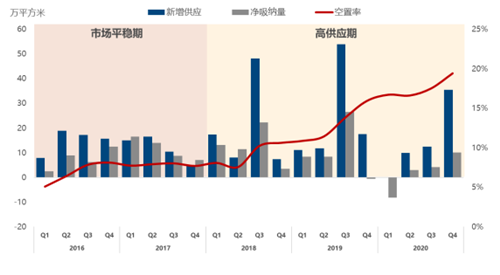 從空置率來看,供需不平衡的問題在2020年被進一步放大,空置率達19.4%,創(chuàng)近十年新高。報告顯示,在2020年四季度,新入市項目體量低于預(yù)期的50萬平方米,僅有約35萬平方米入市。至此,2020年全市場新增供應(yīng)項目約60萬平方米,遠低于預(yù)期水平。高力國際華北區(qū)董事總經(jīng)理嚴區(qū)海認為,主要原因還是由于疫情導(dǎo)致部分項目延遲入市。