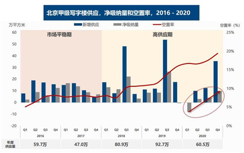 2020年的疫情給商辦地產(chǎn)帶來了較大沖擊,原本處于行業(yè)下行周期的商辦市場,面臨著更大的挑戰(zhàn)。高力國際最新發(fā)布的北京寫字樓市場報告指出,疫情嚴重抑制了企業(yè)辦公需求的釋放,全年實際凈吸納量刷新了有歷史記錄以來的新低,空置率同比上漲至19.4%。寫字樓市場已經(jīng)開啟存量租戶競爭大戰(zhàn),對高凈值企業(yè)租戶的爭奪愈加激烈。