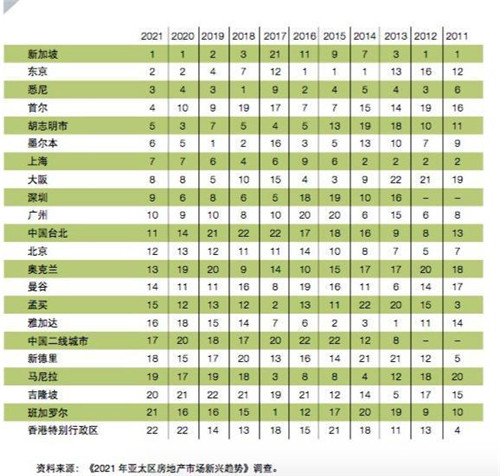 報告指出,2021年亞太地區(qū)最具投資和發(fā)展前景排名前六名的城市分別是新加坡、東京、悉尼、首爾、胡志明市、墨爾本,主要由具有穩(wěn)定和長期前景的大型防御性市場主導,去年排名前六的城市中有5座再次躋身2021年投資前景最好的6座城市。而中國的上海、深圳、廣州分別位列第七、第九和第十名。