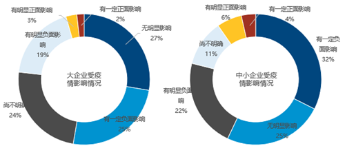 疫情為大企業(yè)帶來的影響相對更小。有超過一半的企業(yè)認(rèn)為無明顯影響或尚不明確。44%的企業(yè)認(rèn)為有負(fù)面影響,僅19%的企業(yè)認(rèn)為有明顯影響。