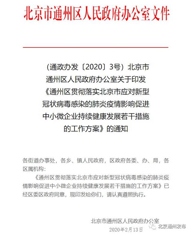 為切實幫助中小微企業(yè)應(yīng)對疫情影響,通州區(qū)結(jié)合城市副中心實際,制定出臺了《通州區(qū)貫徹落實北京市應(yīng)對新型冠狀病毒感染的肺炎疫情影響促進中小微企業(yè)持續(xù)健康發(fā)展若干措施的工作方案》。