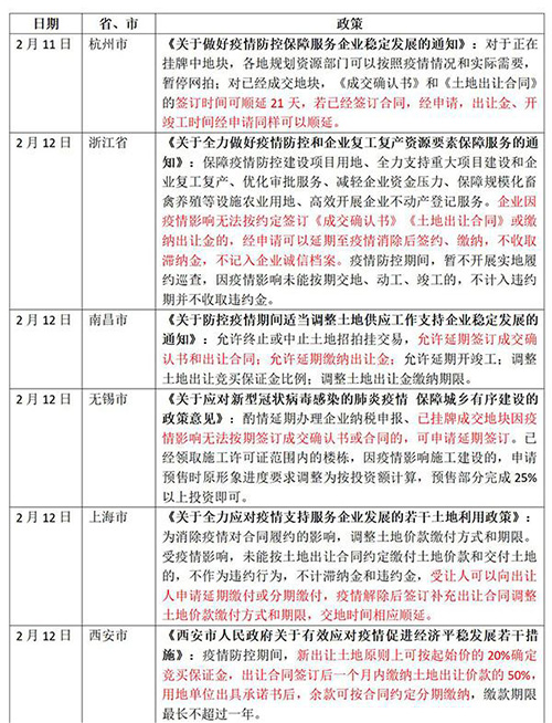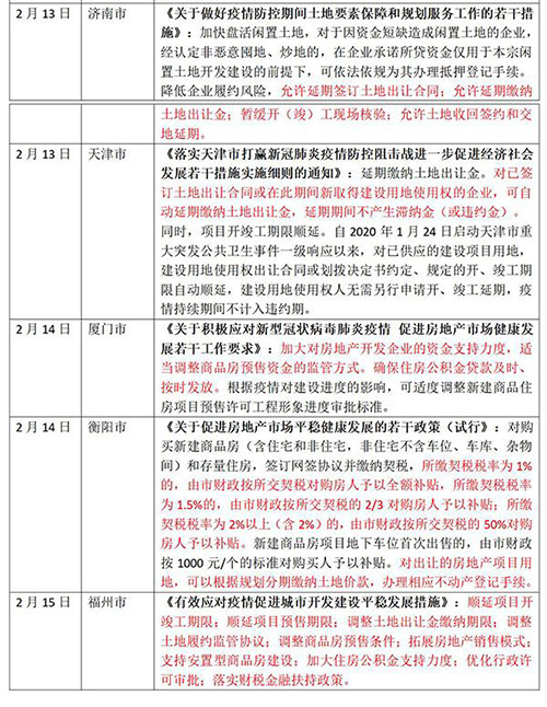 據(jù)不完全統(tǒng)計,截至目前,已有無錫、廈門、衡陽、福州等地相繼出臺政策支持房地產(chǎn)市場平穩(wěn)健康發(fā)展。此外,濟南、西安、杭州、上海、天津、南昌、南京、浙江等省市出臺土地新政應對疫情,部分城市明確土地款可申請延期或分期繳付。