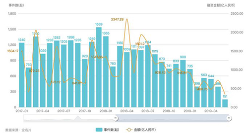 圖:2019年國(guó)內(nèi)一級(jí)市場(chǎng)融資趨勢(shì)圖——融資額相對(duì)以往減辦