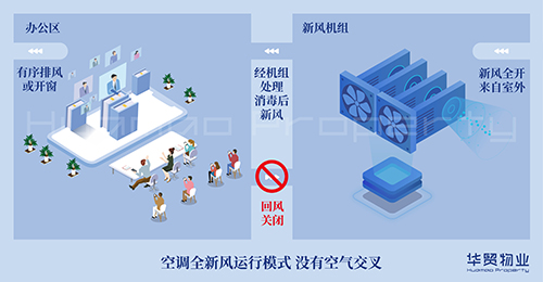 疫情防控期間,大廈工程人員對(duì)寫字樓VAV空調(diào)通風(fēng)系統(tǒng)運(yùn)行模式進(jìn)行調(diào)整,在保證室內(nèi)溫度合適的情況下,關(guān)閉新風(fēng)回風(fēng)系統(tǒng),并增大新風(fēng)風(fēng)量,保證每戶企業(yè)室內(nèi)空氣質(zhì)量,杜絕空氣交叉感染。
