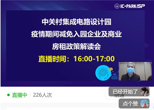 IC PARK積極響應(yīng)國家關(guān)于中小微企業(yè)房租減免政策號召、及時落實北京市人民政府“16”條措施中房租減免具體舉措,制定中關(guān)村集成電路設(shè)計園疫情期間房租減免相關(guān)政策,于2月22日將IC PARK園區(qū)相應(yīng)房租減免政策通知下發(fā)至園區(qū)入駐企業(yè)、商戶。并于2月24日下午通過網(wǎng)絡(luò)在線直播形式開展“中關(guān)村集成電路設(shè)計園疫情期間減免入園企業(yè)及商業(yè)房租政策解讀會”就此事進行詳細介紹在線宣講及在線答疑。
