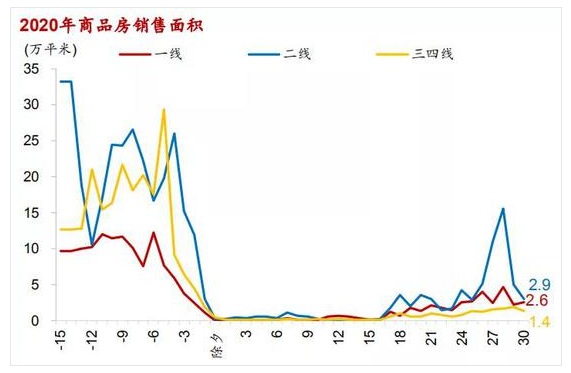 從區(qū)域結(jié)構(gòu)上看,春節(jié)假期前后,房地產(chǎn)市場一般會出現(xiàn)返鄉(xiāng)置業(yè)潮,即三四線城市商品房銷售雖然成交減少但顯著好于一二線城市。2015-2019年的春節(jié)假期的前一周與后一周,三四線商品房銷售面積(10.4萬平米/天)是一二線城市(23.0萬平米/天)的0.45倍;而春節(jié)假期期間,三四線商品房銷售面積(0.85萬平米/天)是一二線城市(0.59萬平米/天)的1.44倍。今年春節(jié)假期前一周與后一周,三四線商品房銷售面積(6.4萬平米/天)是一二線城市(11.4萬平米/天)的0.56倍,而春節(jié)假期期間,三四線商品房銷售面積(0.14萬平米/天)是一二線城市的(0.40萬平米/天)0.35倍,比值較春節(jié)前后小幅下滑。今年春節(jié)“返鄉(xiāng)置業(yè)”景氣不再,主要受到疫情沖擊下人口流動受限影響。