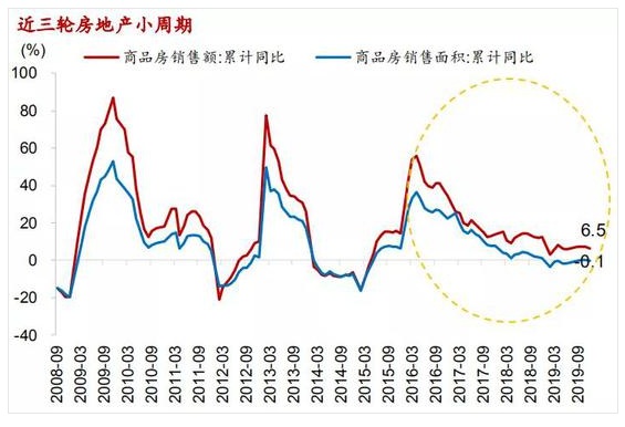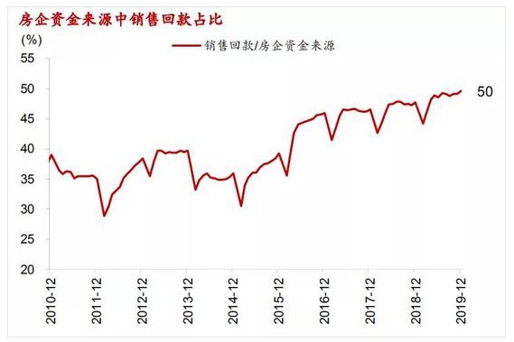 銷售下滑對房企資本開支造成拖累。當(dāng)商品房銷售金額增速回落時,房企的投資決策將趨于謹(jǐn)慎,投資速度亦趨于下降。這是因為銷售回款是房企資金來源的“主動脈”。房企普遍具有高杠桿的特征,2019年三季度,A股上市房企的資產(chǎn)負(fù)債率(總資產(chǎn)/總負(fù)債)高達(dá)80.6%,僅次于金融業(yè),這使得現(xiàn)金流成為了房企的生命線。而在在房地產(chǎn)調(diào)控政策持續(xù)收緊影響下,銀行貸款與信托融資來源大幅收緊,銷售回款對于房企的重要性日趨上升,目前占比已達(dá)50%,是房企資金來源中的最大項。
