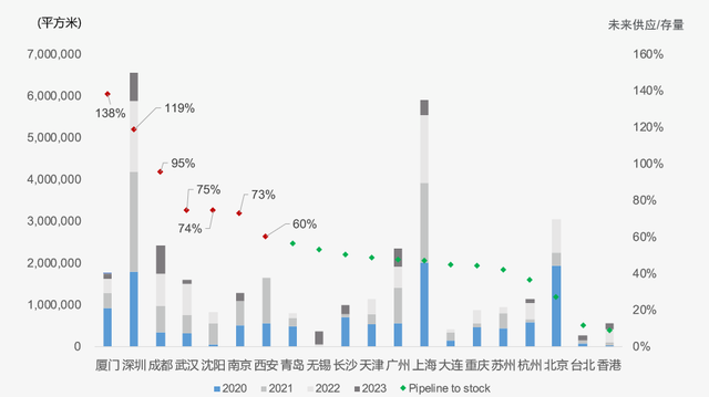 2019~2023年部分城市甲級寫字樓供應量數(shù)據(jù)來源:戴德梁行