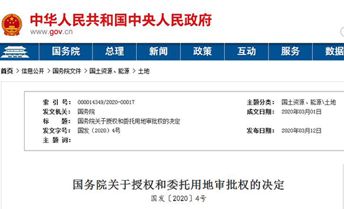 房訊網(wǎng)訊 3月12日,國務(wù)院發(fā)布《關(guān)于授權(quán)和委托用地審批權(quán)的決定》(國發(fā)〔2020〕4號),在嚴格保護耕地、節(jié)約集約用地的前提下,進一步深化“放管服”改革,改革土地管理制度,賦予省級人民政府更大用地自主權(quán)。