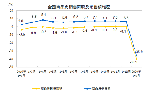 房訊網(wǎng)訊 據(jù)國家統(tǒng)計局?jǐn)?shù)據(jù),1—2月份,商品房銷售面積8475萬平方米,同比下降39.9%。其中,住宅銷售面積下降39.2%,辦公樓銷售面積下降48.4%,商業(yè)營業(yè)用房銷售面積下降46.0%。商品房銷售額8203億元,下降35.9%。其中,住宅銷售額下降34.7%,辦公樓銷售額下降40.6%,商業(yè)營業(yè)用房銷售額下降46.0%。