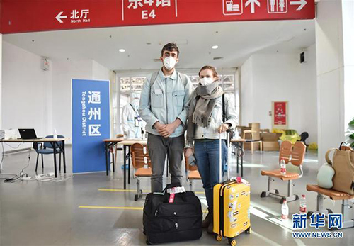 3月14日,在新國展轉運集散地北京市通州區(qū)集散點,從曼谷飛來北京的兩名俄羅斯旅客剛剛辦理完相關手續(xù)。新華社發(fā)(陳鐘昊攝)