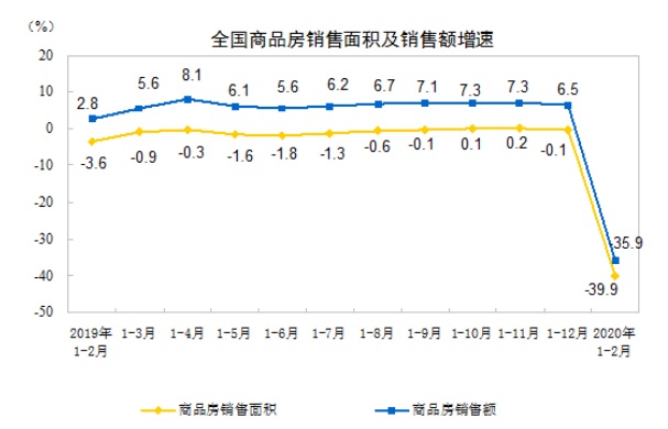 1—2月份,商品房銷售面積8475萬平方米,同比下降39.9%。其中,住宅銷售面積下降39.2%,辦公樓銷售面積下降48.4%,商業(yè)營(yíng)業(yè)用房銷售面積下降46.0%。商品房銷售額8203億元,下降35.9%。其中,住宅銷售額下降34.7%,辦公樓銷售額下降40.6%,商業(yè)營(yíng)業(yè)用房銷售額下降46.0%。