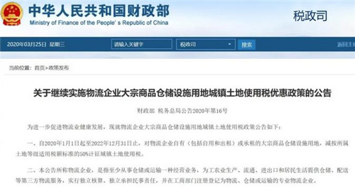 公告明確,自2020年1月1日起至2022年12月31日止,對(duì)物流企業(yè)自有(包括自用和出租)或承租的大宗商品倉儲(chǔ)設(shè)施用地,減按所屬土地等級(jí)適用稅額標(biāo)準(zhǔn)的50%計(jì)征城鎮(zhèn)土地使用稅。
