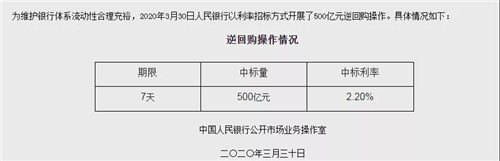 房訊網(wǎng)訊 3月30日,央行官網(wǎng)消息,為維護(hù)銀行體系流動(dòng)性合理充裕,2020年3月30日中國人民銀行以利率招標(biāo)方式開展了500億元7天期逆回購操作,中標(biāo)利率為2.2%,較此前的2.4%下調(diào)20個(gè)基點(diǎn)。