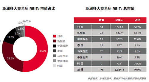 研究報(bào)告表明,截至2019年底亞洲市場(chǎng)上活躍的REITs共計(jì)178支,總市值達(dá)2,924億美元,同比增長(zhǎng)約25%,其中日本、新加坡和中國(guó)香港三地REITs市值合計(jì)占比達(dá)93%。