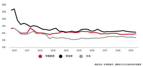 新加坡REITs市場(chǎng)分派收益率為6.2%,比中國(guó)香港高出0.6個(gè)百分點(diǎn),而日本REITs市場(chǎng)的分派收益率最低,為4.0%。三地REITs市場(chǎng)的杠桿率均未超過(guò)45%,其中日本市場(chǎng)最高,達(dá)44%。2019年新加坡和日本REITs市場(chǎng)均實(shí)現(xiàn)了10年來(lái)最強(qiáng)勁的年度綜合收益,分別為25.3%和25.6%。得益于此,新加坡和日本REITs的市凈率較去年有較大提高。此外,香港REITs市場(chǎng)時(shí)隔6年再有房托基金上市,招商局商業(yè)房地產(chǎn)投資信托基金于2019年12月在港交所主板掛牌,集資金額逾30億港元。