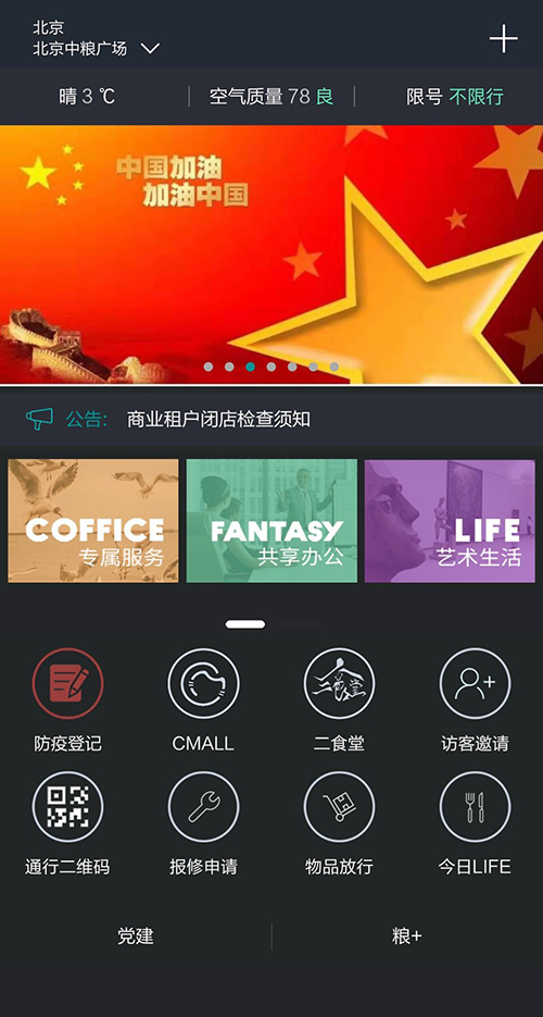 科技創(chuàng)新是抗擊疫情的重要手段;ヂ(lián)網(wǎng)、人工智能和大數(shù)據(jù)等信息技術(shù)手段的應(yīng)用,大大提高了企業(yè)能效,顯著提升了抗擊疫情、服務(wù)市場的維度與寬度。而由大悅城控股打造的3C運營服務(wù)體系也成為寫字樓與產(chǎn)業(yè)園區(qū)對抗疫情不可或缺的一環(huán)。3C運營服務(wù)體系是通過智慧云平臺為租戶企業(yè)提供高效解決方案的運營體系,滿足B端租戶企業(yè)服務(wù)需求及C端客群生活需求。3C運營服務(wù)體系包括COFCO FANTASY(悅創(chuàng))、COFCO LIFE(悅享)、COFFICE(悅智)目前,3C運營服務(wù)體系已全面覆蓋大悅城旗下寫字樓與產(chǎn)業(yè)園,覆蓋面積將近兩百萬平方米。