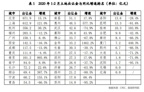從土地出讓金收入來看,2月,40個典型城市土地出讓金收入為1525.9億元,環(huán)比下降15.2%,同比增加10.7%。2020年1-2月,40個典型城市土地出讓金累計收入3325.1億元,同比下降6.4%。