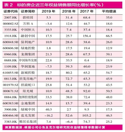 《紅周刊》記者梳理標(biāo)的房企近三年的權(quán)益土儲(chǔ)(見表1)與銷售增速(見表2)數(shù)據(jù)發(fā)現(xiàn),在第一梯隊(duì)房企“碧萬(wàn)恒融”中,融創(chuàng)中國(guó)近三年的平均銷售增速居行業(yè)首位,高達(dá)66.5%。在業(yè)績(jī)?cè)鲩L(zhǎng)迅猛的同時(shí),由于融創(chuàng)許多項(xiàng)目都來(lái)自收并購(gòu),其近三年的土儲(chǔ)成本也僅約3129元/㎡。