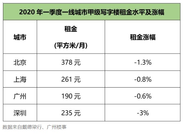 2、甲級(jí)寫(xiě)字樓最新租金水平,北京最高,378元/m⊃2;/月,其次是上海261元/m⊃2;/月,深圳235元/m⊃2;/月,廣州最低,190元/m⊃2;/月。