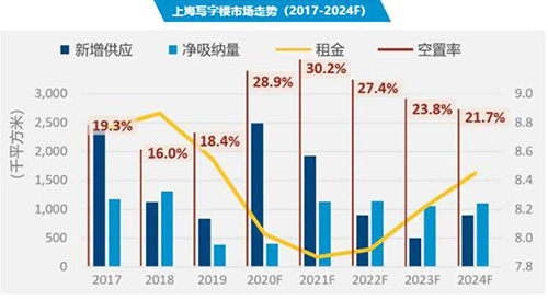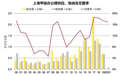 事實上,上海寫字樓市場整體空置率更甚于甲級市場。據(jù)高力國際最新統(tǒng)計,一季度上海寫字樓整體空置率為19.2%,環(huán)比下降0.8個百分點,但這一空置率預計將在2020年末達到28.9%。