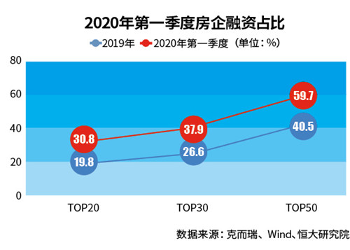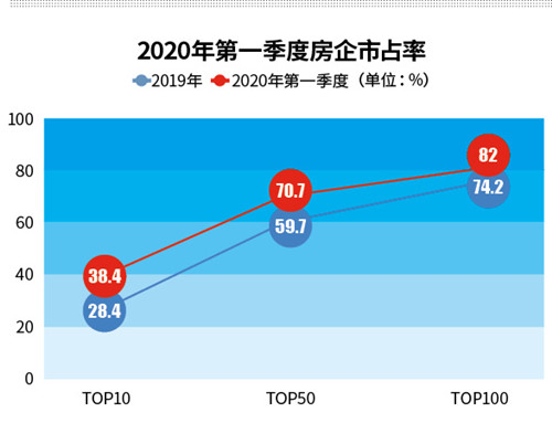 從行業(yè)集中度看,兩級(jí)分化格局正不斷加劇。來自恒大研究院數(shù)據(jù)顯示,2019年,前10強(qiáng)、前50強(qiáng)、前100強(qiáng)房企市占率分別高達(dá)28.4%、59.7%和74.2%。到了2020年一季度,上述房企市占率分別較2019年再提升10.0、11.0和7.8個(gè)百分點(diǎn)。