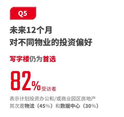 房訊網(wǎng)訊 戴德梁行資本市場部發(fā)起的投資者意向調(diào)查顯示,未來12個月對不同物業(yè)的投資偏好,寫字樓仍是首選,82%受訪者表示計劃投資辦公和/或商業(yè)園區(qū)房地產(chǎn)。