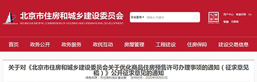 近日,北京市住建委發(fā)布《關(guān)于優(yōu)化商品住房預(yù)售許可辦理事項(xiàng)的通知》的征求意見稿,對(duì)商品住房項(xiàng)目預(yù)售許可截止日期及申請(qǐng)預(yù)售許可的最低規(guī)模要求進(jìn)行了優(yōu)化調(diào)整。