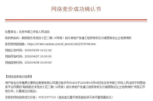 4月8日,在15次競(jìng)價(jià)之后,引發(fā)超7萬(wàn)次圍觀,2方報(bào)名的中弘大廈拍賣最終落槌。北京植晟云廈物業(yè)管理有限公司通過(guò)競(jìng)買號(hào)M1691報(bào)價(jià)33.12億元,溢價(jià)10.5億元拍得中弘大廈。