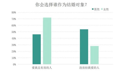 “你愛的人沒有房,愛你的人有房”,你將會選擇誰作為結婚對象?調查數(shù)據(jù)顯示,男性選擇“沒房但我愛的人”較高,占比達54%;女性選擇“愛我且有房”的比例高達72%。相比之下,女性在現(xiàn)實面前表現(xiàn)得更加“物質”一些,不僅會看中“有房”這一關鍵性要素,而且也很明確地選擇“愛我的人”,而非“我愛的人”,這也許是追尋真正所愛之人太難了。
