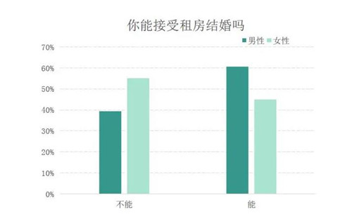 貝殼研究院調研數(shù)據(jù)顯示,“租房結婚”和“無房不婚”是當下社會較為普遍存在的兩種婚姻觀念,占比幾乎持平。但是分性別來看,男女性對租房結婚接受與否的態(tài)度大不同,60.6%的男性能夠接受租房結婚,而只有44.9%的女性愿意租房結婚。